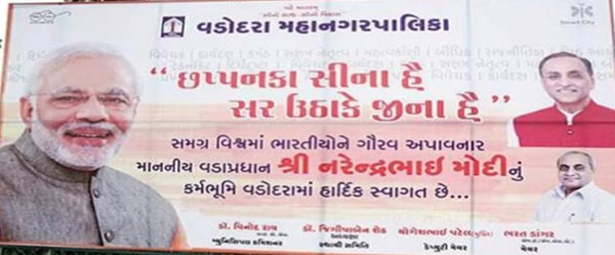 ગુજરાત મુલાકાતે આવનારા વડાપ્રધાન નરેન્દ્ર મોદીની આગમન પહેલાં વડોદરાના મ્યુનિસિપલ કોર્પોરેશને તેમના સ્વાગતમાં ’56 ઇંચ કા સીના’વાળા હોર્ડિંગ્સ લગાવ્યા છે. આ હોર્ડિંગ્સ પર તેની સાથે જ સ્માર્ટસિટી અને સ્વચ્છ ભારતના લોગો પણ લગાવ્યા છે. પીએમ મોદી 22મી ઑક્ટોબરના રોજ વડોદરા ઇન્ટરનેશનલ એરપોર્ટનું ઉદ્ઘાટન કરશે. તેની સાથે જ દિવ્યાંગોના એક કાર્યક્રમમાં ભાગ લેશે. આ હોર્ડિંગ્સ પર પીએમ મોદી, ગુજરાતના મુખ્યમંત્રી વિજય રૂપાણી, નાયબ મુખ્યમંત્રી નીતિન પટેલનો ફોટો પણ પ્રકાશિત કરાયો છે. તેની સાથે જ હોર્ડિંગ્સમાં પીએમ મોદીને વિવેચક, કુશળ, સક્ષમ નેતૃત્વ, મહત્વકાંક્ષી, બૌદ્ધિક, ટેક્નોક્રેટ, અને વિઝન ધારવાત બતાવ્યા છે. હોર્ડિંગ્સની નીચેના ભાગમાં સ્વાગત કરનારાઓમાં મ્યુનિસિપલ કમિશ્નર વિનોદ રાય, સ્ટેન્ડિંગ કમિટીના ચેરમેન ડૉ.જીગીશા શેઠ, ડેપ્યુટી મેયર યોગેશ પટેલ, અને મેયર ભરત ડાંગરના નામ લખ્યા છે. આ હોર્ડિંગ્સને કારેલીબાગ, અલકાપુરી, અને ગેંડા સર્કલ સહિત સમગ્ર શહેરમાં લગાવામાં આવ્યા છે. આ અંગે વડોદરાના મ્યુનિસપલ કમિશ્નર વિનોદ રાયે પત્રકારોને જણાવ્યું હતું કે મેં જાતે જ હોર્ડિંગ્સ જોયા છે અને મેં મારી ટીમને નિર્દેશ આપ્યો કે અમે લોકો રાજકીય કનેકશનવાળી દરેક વસ્તુને નજરઅંદાજ કરીશું. અમે લોકો હવે આ હોર્ડિંગ્સને બદલી નાંખીશું. લેન્ડ એન્ડ એસ્ટેટ (કોમર્શિયલ) વિભાગના અધિકારીઓએ હોર્ડિંગ્સ લગાવા માટે કોર્પોરેશનને જગ્યા ફાળવી છે. તેમણે કહ્યું, ‘વીએમસીને શહેરના કેટલાંક વિસ્તારમાં હોર્ડિંગ્સ લગાવા માટે જગ્યા આપી હતી. પરંતુ અમે હોર્ડિંગ્સનું કન્ટેંટ તપાસ્યું નહોતું.’ એક અધિકારીએ કહ્યું કે હોર્ડિંગ્સ વિભાગની પબ્લિસિટી ટીમે આ ડિઝાઈન કર્યું છે, એવામાં અમે લોકોએ કંટેંટ ક્રોસ ચેક કર્યું નથી.હતા.