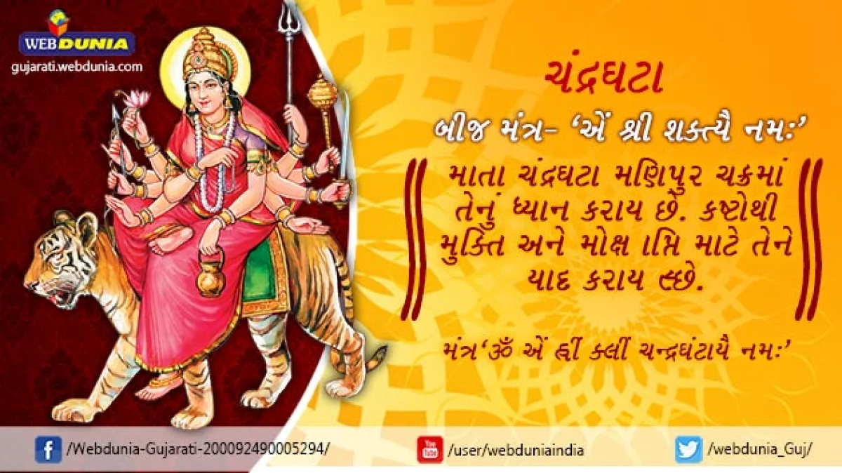 આદિશક્તિ દુર્ગાનું ત્રીજુ રૂપ એટલે શ્રી ચંદ્રઘંટા. આમના મસ્તક પર ઘંટના આકારનો અર્ધચંન્દ્ર છે. એટલા માટે તેમને ચંદ્રઘંટા કહેવામાં આવે છે. નવારત્રિના ત્રીજા દિવસે આ દેવીની પુજા અર્ચના કરવામાં આવે છે. આમની પુજા કરવાથી મણિપુર ચક્રની પ્રાપ્તિ થાય છે અને તેના દ્વારા મળતી સિધ્ધિઓ તેની જાતે જ મળી જાય છે તેમજ સાંસારિક કષ્ટોથી મુક્તિ મળી જાય છે.