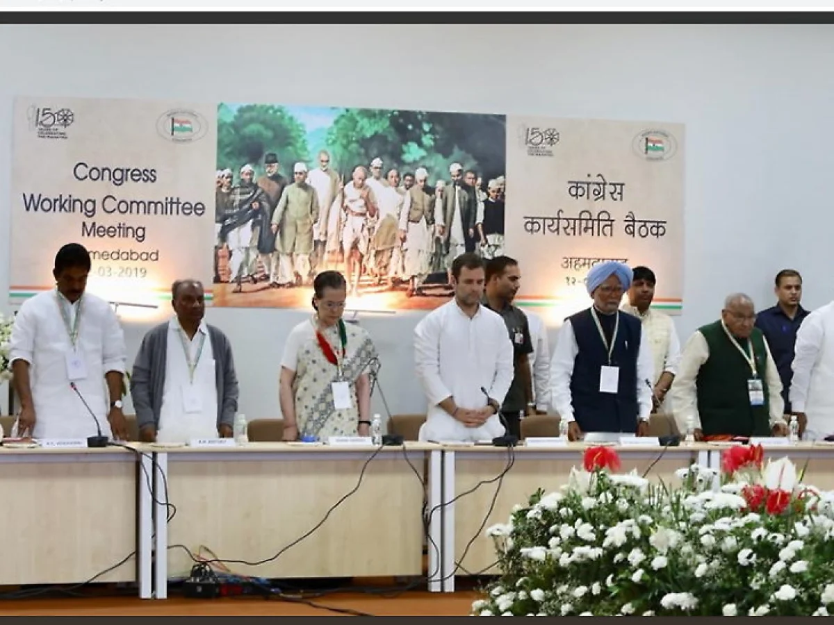 ગુજરાતમાં 58 વર્ષ બાદ અમદાવાદ ખાતે કોંગ્રેસ વર્કિંગ કમિટીની બેઠક યોજાઈ, શહેરના શાહિબાગ સ્થિત સરદાર પટેલ સ્મારક ખાતે પૂર્વ વડાપ્રધાન મનમોહનસિંહ, રાહુલ ગાંધી, સોનિયા ગાંધી સહિત પ્રિયંકા ગાંધીએ પણ ગાંધીજી તથા પુલવામાં હૂમલામાં શહિદ થયેલા સૈનિકોને અંજલિ અર્પણ કરી હતી. આ પહેલા તેમણે સરદાર પટેલને સુત્તરની આંટી પહેરાવાની સ્મરણાંજલિ આપી હતી. અહીં રાહુલ ગાંધીએ કોંગ્રેસના ધ્વજ લહેરાવ્યો હતો. સરદાર સ્મારકમાં ખાતે કોંગ્રેસની કાર્યકારિણીની બેઠક યોજાઈ હતી. આ બેઠકમાં આરએસએસ અને ભાજપના ફાંસીવાદની વિચારધારા, નફરત, ગુસ્સો અને વિભાજનવાદી વિચારધારાને પરાજીત કરવા માટે ઠરાવ કર્યો હતો. આ બેઠકમાં પૂર્વ વડાપ્રધાન મનમોહનસિંહે સલાહ આપતા કહ્યું કે, યુપીએ સરકારની સિદ્ધિઓ લોકો સુધી પહોંચાડવાની જરૂર છે. આ ઉપરાંત તેમણે મોદી સરકારની ટીકા કરતા કહ્યું કે ,'મોદી સરકારની ખરાબ નીતિને કારણે અર્થ વ્યવસ્થાની કમર તૂટી ગઇ છે.' જ્યારે સોનિયા ગાંધીએ પીએમ મોદીની ઝાટકણી કાઢતા કહ્યું, 'મોદી રાષ્ટ્રનાં હિતનાં ભોગે રાજનીતિ કરે છે. મોદી પીડિત બનવાનો પ્રયત્ન કરે છે. જ્યારે સાચા અર્થમાં દેશની જનતા પીડિત છે.
