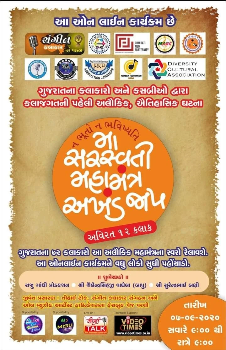 કલાકારો અને કસબીઓ અત્યારે મોટી મુસીબત માંથી પસાર થઇ રહ્યા છે..કલાકાર એ સરસ્વતી પુત્ર કહેવાય છે.. ફિલ્મ, નાટક, સંગીત, હાસ્ય, નૃત્ય સાથે જોડાયેલા ગુજરાત ના લાખો કલાકારો/કસબીઓના કામ ફરી પાછા ખુબ ઝડપથી શરૂ થાય તે માટે "મા સરસ્વતી મહામંત્ર અખંડ જાપ" નું એક ભવ્ય આયોજન તારીખ ૭ સપ્ટેમ્બર ( આજે ), સોમવારે સવારે ૯ થી રાત્રે ૯ એમ સતત ૧૨ કલાક સુધી કરવામાં આવ્યું છે. જેમાં ગુજરાતના અનેક નામી અનામી કલાકારો સરસ્વતી મહામંત્રના અલૌકિક સ્વરો રેલાવશે.