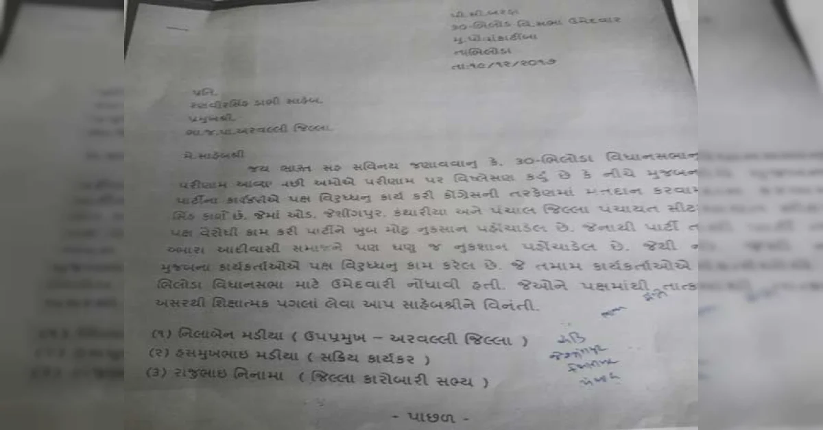 ગુજરાત વિધાનસભા ચૂંટણીમાં ભિલોડાના ભાજના ઉમેદવાર અને છોટા ઉદેપુરના પૂર્વ SP પી.સી. બરંડા ચૂંટણી હાર્યા બાદ પોતાના જ પક્ષના અધિકારીઓ સામે મોરચો માંડ્યો છે. અરવલ્લીમાં ભિલોડાના ભાજપના ઉમેદવાર પી.સી. બરંડાએ જિલ્લાના ઉપપ્રમુખ સહિત 5 પદાધિકારીઓને હાર માટે જવાબદાર ગણાવી તેમની સામે ફરિયાદ કરી છે. બરંડાએ આક્ષેપ કર્યો છે કે, ભાજપના કાર્યકરોએ પક્ષ વિરૂદ્ધ કાર્ય કરી કોંગ્રેસની તરફેણમાં મતદાન કરાવ્યું છે. આ મામલે બરંડાએ જવાબદાર અધિકારીઓ સામે પગલાં લેવા અરવલ્લી ભાજપ જિલ્લા પ્રમુખ અને પ્રદેશ પ્રમુખને લેખિત ફરિયાદ કરી છે.બારંડાએ પોતાની ફરિયાદમાં હસમુખ માડિયા અને તેમના પત્ની મીરા, રાજુ નિનામા, જયવંતિકાબેન ડામોર, બળવંત ભોઈના નામ લીધા છે. બારંડાની ફરિયાદ અનુસાર આ લોકોએ ભિલોડા સીટ માટે ટિકીટ માંગી હતી પરંતુ પાર્ટીએ તેમને ટિકીટ નહોતી આપી. આ લોકોએ બદલો લેવા માટે કોંગ્રેસ નેતાનો પ્રચાર કર્યો હતો.