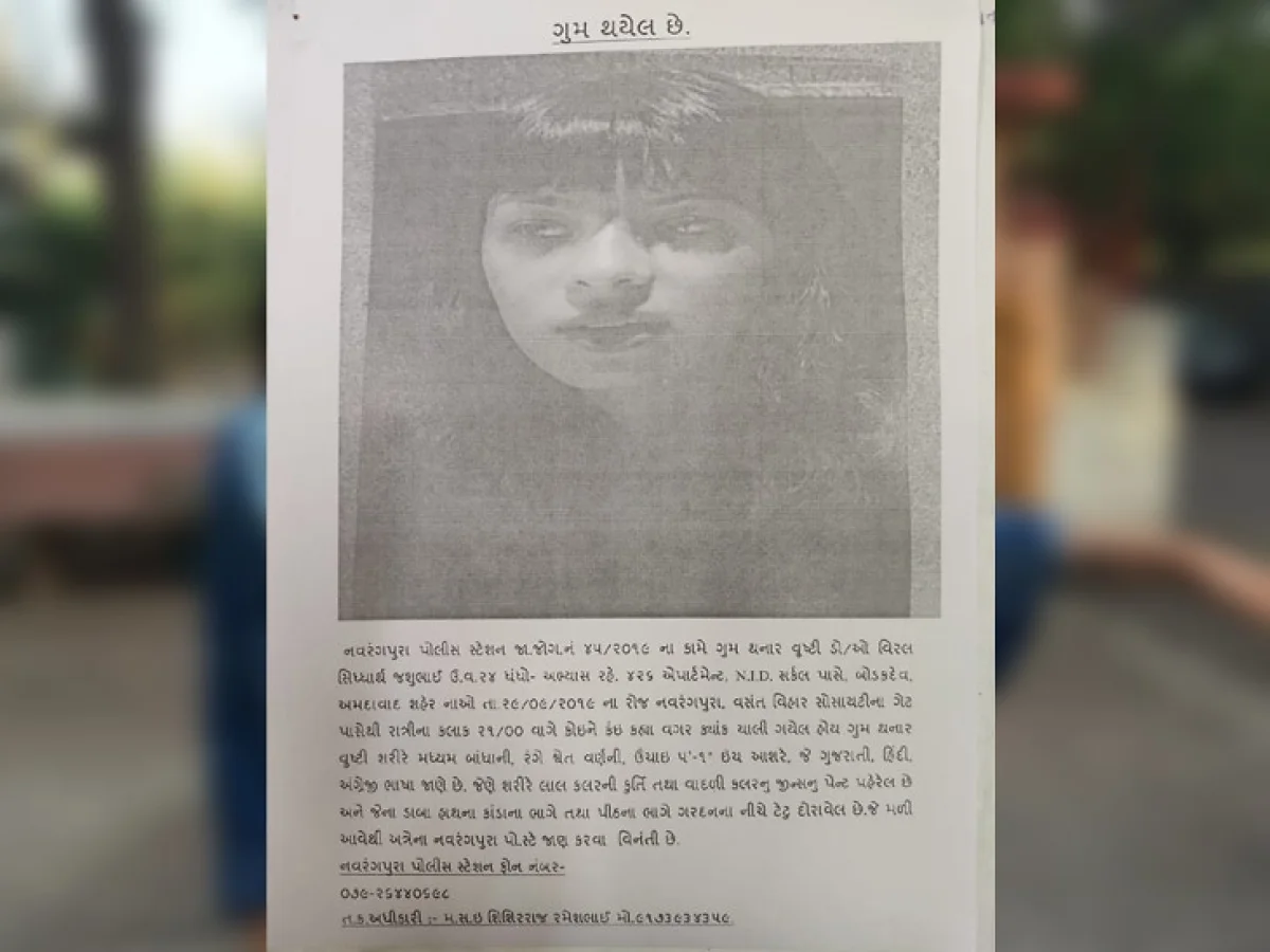 અમદાવાદ શહેરના વસ્ત્રાપુર વિસ્તારમાં રહેતી 23 વર્ષીય યુવતી વૃષ્ટિના ગુમ થવા મામલે નવરંગપુરા પોલીસે તપાસનો ધમધમાટ શરૂ કર્યો છે. બોલિવૂડ એક્ટ્રેસ સોહા અલી ખાનના ટ્વીટ બાદ જાગેલી પોલીસે વૃષ્ટિ અને તેના મિત્ર શિવમ પટેલની શોધખોળ શરૂ કરી છે. વૃષ્ટિના મોબાઈલનું લોકેશન મહેસાણા હોવાની જાણ થઈ છે. જેને પગલે વૃષ્ટિ અને શિવમને શોધવા પોલીસે 3 ટીમ બનાવી છે. જેમાં પીએસઆઇ લેવલના અધિકારી છે. શિવમ અને વૃષ્ટિ બંને ઉવારસદ નજીક આવેલી કોલેજમાં સાથે ભણતા હતા. મહેસાણા લોકેશન પર તપાસ કરવામાં આવી છે. આ ઉપરાંત પોલીસે વૃષ્ટિ ગુમ થયાનું પોસ્ટર લગાવ્યું છે. તેની ભાળ મેળવનારને પોલીસનો સંપર્ક કરવા જણાવ્યું છે. શિવમનો પરિવાર અમેરિકા રહેતો હોવાનું જાણવા મળ્યું છે. વૃષ્ટિ શિવમના ઘરે આવી હતી અને ત્યાંથી ગુમ થઈ છે. વૃષ્ટિ જશુભાઈ નામની 23 વર્ષીય યુવતી છેલ્લા 3 દિવસથી ગુમ થઈ છે. તેના પરિવારજનોએ આ મામલે વસ્ત્રાપુર પોલીસ સ્ટેશનના ગુમ થયા મામલે નોંધ કરાવી છે. વૃષ્ટિને શોધવામાં સોશિયલ મીડિયાની મદદ લેવામાં આવી રહી છે. બોલિવૂડ એક્ટ્રેસ સોહા અલી ખાન દ્વારા વૃષ્ટિના ફોટો સાથે ટ્વીટ કરવામાં આવ્યું છે. ટ્વીટમાં સોહા અલી ખાને વૃષ્ટિ છેલ્લા 2 દિવસથી ગુમ છે અને તેનો ફોન બંધ આવે છે. તે અમદાવાદમાં રહે છે અને તેના માતાપિતા ચિંતા કરી રહ્યાં છે જેથી મદદ કરો અને એક મોબાઈલ નંબર લખ્યો છે. સોહા અલી ખાનના ટ્વીટ બાદ અનેક લોકોએ ટ્વીટ કર્યું હતું જેમાં ગુજરાત પોલીસના ટ્વિટર એકાઉન્ટમાં ટેગ કરી મદદ માંગતા ગુજરાત પોલીસે અમદાવાદ પોલીસને ટ્વીટ કરી આ મામલે તપાસ માટે કહ્યું હતું.