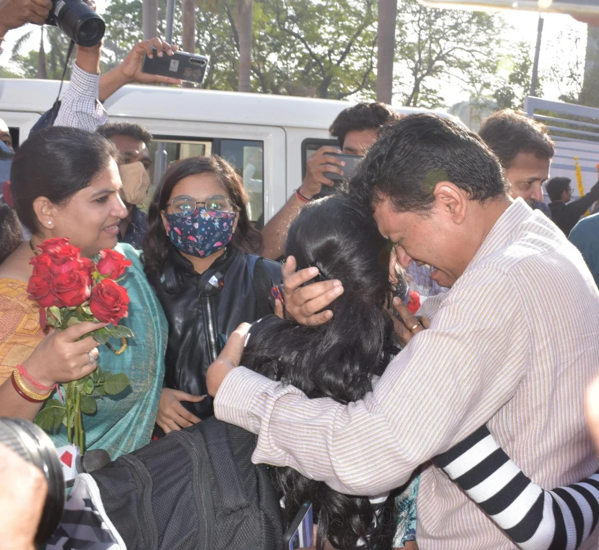 યુક્રેનના ચેનીવિત્સી શહેરમાં રહેતી અને બુકોવિન્યન સ્ટેટ મેડિકલ યુનિવર્સિટીમાં MBBS નો અભ્યાસ કરતી ૨૦ વર્ષીય વિદ્યાર્થિની આરશ્વી કલ્પેશભાઈ શાહ સુરત પરત આવતાં જ આંસુભર્યા ચહેરે માતાપિતાને ભેટી પડી હતી.